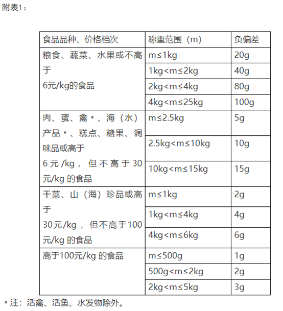 第五条 零售商品经销者使用称重计量器具每次当场称重商品,在本办法附表1、附表2称重范围内,经核称商品的实际重量值与结算重量值之差不得超过该表规定的负偏差。
